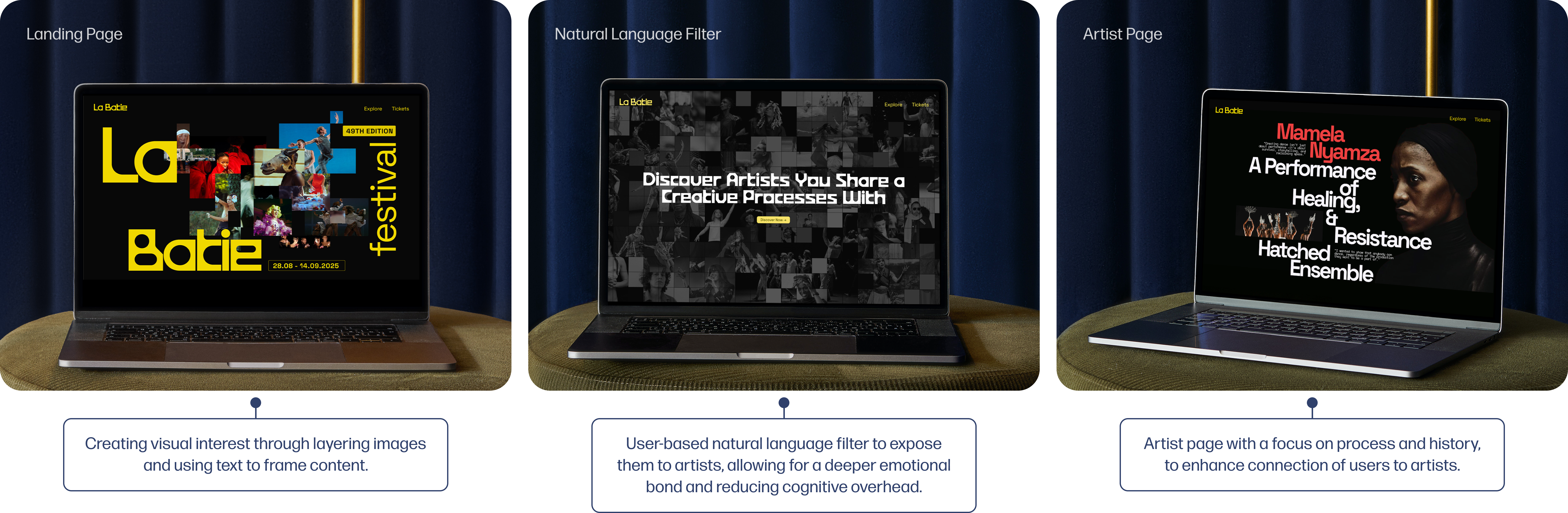 The artist page uses large, structural text to encourage scrolling, and scroll-to-reveal interaction for smaller text so content is broken down into chunks, making it easier for users to digest. It focuses on highlighting the process and intention behind the performance, going beyond the final result to reveal how the work was shaped, allowing users to feel more deeply about the performance and the atrist who created it.