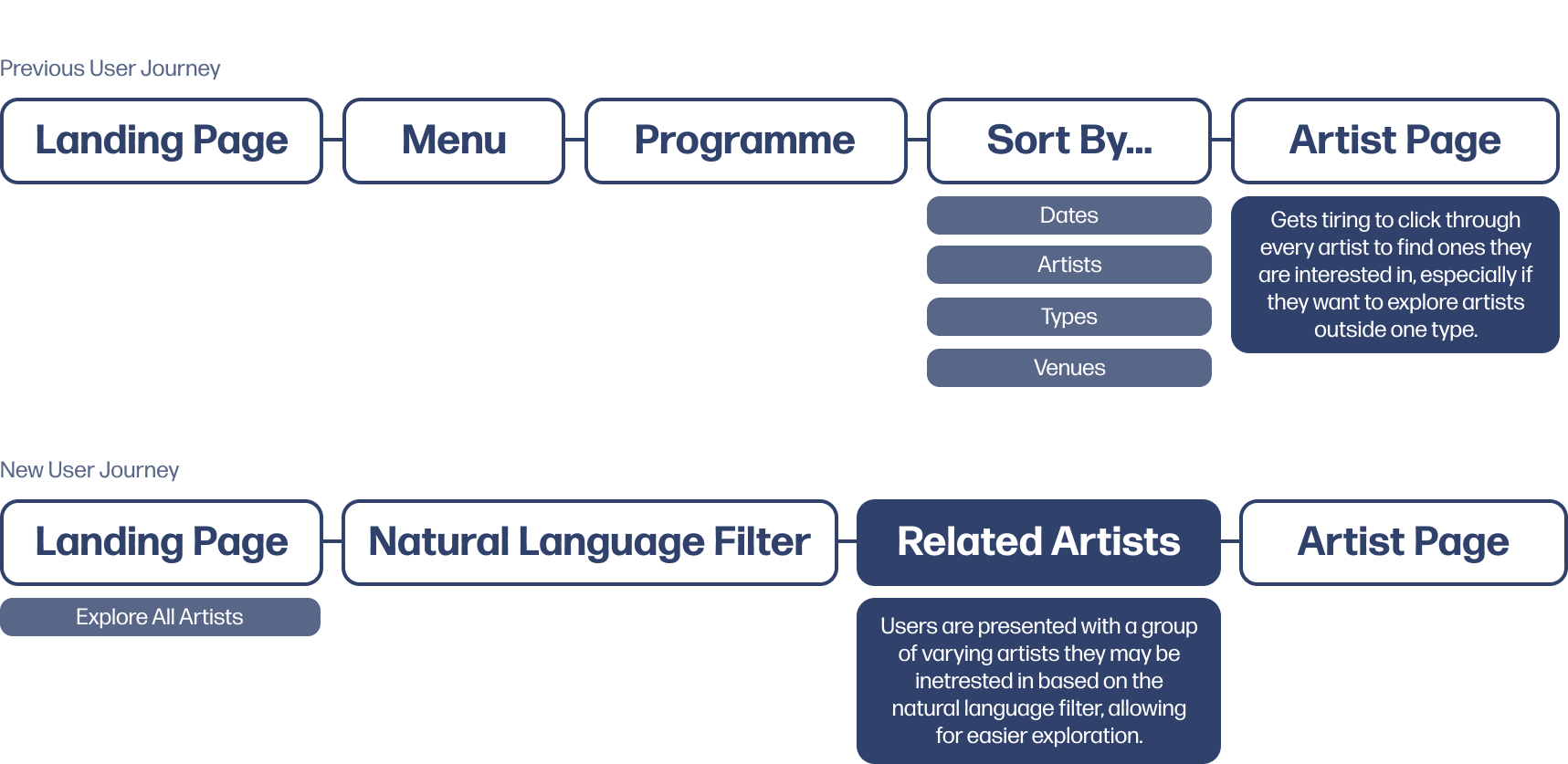 As mentioned before, the current website was lacking ways to find and connect emotionally to artists. We wanted to solve this issue in an interactive way rather than just listing arists, so I took a look at the user-flow and sought out how I could consolidate it to reduce congnitive overhead for users wanting to explore artists at the festival.
