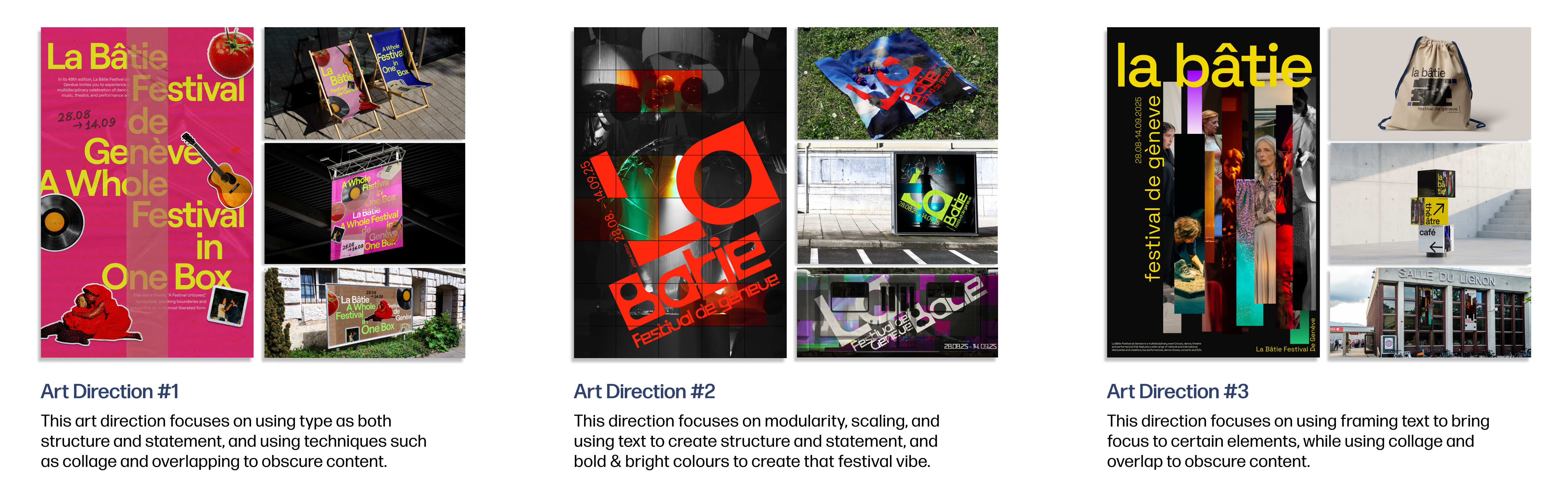 With experimentation on over 250 poster iterations, we were able to create three main art directions, applying them to posters and two physical assets. I was was in charge of designing and creating the physical asset mockups, using both Figma and Photoshop for the design and mockups. We ended up choosing the 2nd direction for web.